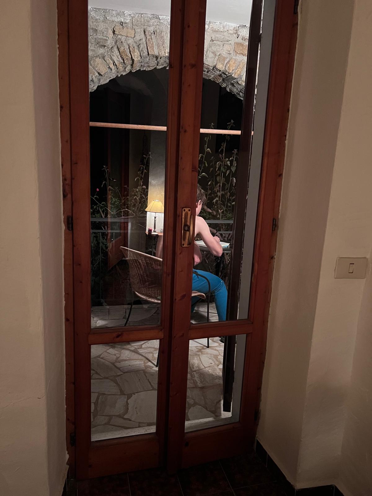 Widzę mojego syna za szybą, w połowie piżamy, bo na T-shirt jest za gorąco, pochylonego nad pisaniem.
