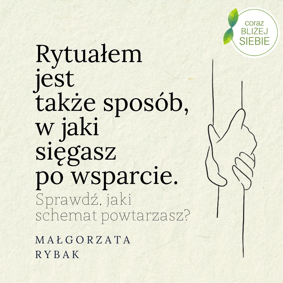 Rytuałem może być wyjście na własną terapię, coaching czy grupę wsparcia – w powtarzalnym rytmie. Jeśli staje się to obowiązkiem, znaczy, że zgubiliśmy intencję i potrzebujemy sobie przypomnieć sens, po co to robimy.